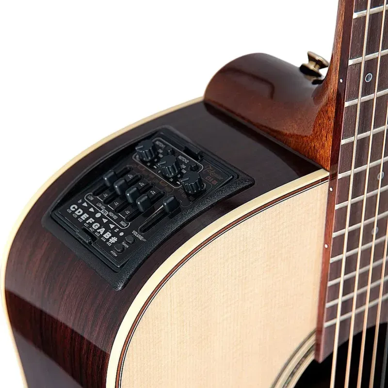 El elegante dreadnought P5DC de Takamine combina tradición con refinamientos contemporáneos, incluyendo una tapa de pícea sólida resonante con refuerzo, para una claridad y proyección superiores, y una parte posterior y lados sólida de palorosa para un sonido cálido y rico. El P5DC presenta el sistema de preamplificador CTP-3 Cool Tube ™ patentado por Takamine junto con la exclusiva cápsula debajo del sillín Palathetic ™ para una respuesta amplificada sin igual. El CTP-3 de doble canal proporciona un tono de tubo de baja tensión, variable, ecualizador de tres bandas con rango medio paramétrico, entrada auxiliar y volumen (para usar cuando se agrega una segunda capsula, y un afinador cromático.